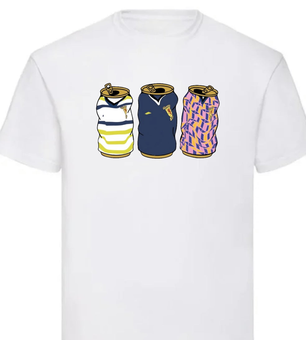 Scotland x TerraceNova .Three kits. Three crushed cans. One unforgettable era. This bold white tee takes you back in time with Scotlands classic kits as crushed beer cans a creative nod to terrace culture, throwback sponsors, and the beautiful game. A fan favourite with a proper Scottish attitude.